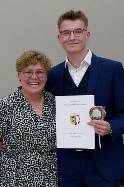 Der Höhepunkt der Feier war die Prämierung der herausragenden Prüfungsleistungen. Mia-Charlott Walewski (Apollo-Optik Holding GmbH & Co. KG, Kiel) als gesamtbeste Auszubildende war leider nicht bei der Feier anwesend. Mit dem Preis der Firma Carl Zeiss Vision für die beste praktische Prüfungsleistung (Bohrbrille) wurde Tristan Heesch (Fielmann AG & Co. OHG, Itzehoe) ausgezeichnet.